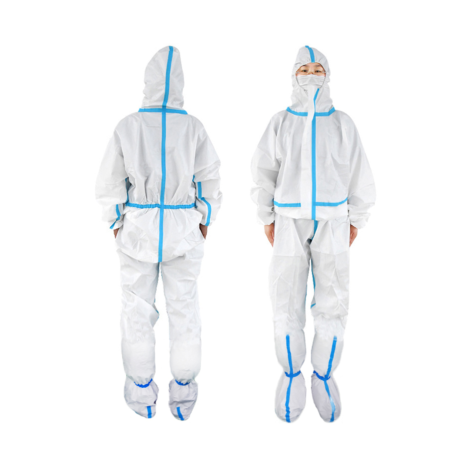 醫(yī)用一次性使用防護(hù)服為具有特定液體阻隔功能、特定強(qiáng)度、過濾效率阻燃性能、抗靜電和靜電衰減功能的適宜材料制成,分為連身式或分身式兩種,由連帽上衣、褲子組成,袖口、腳踝口為彈性收口,帽子面部收口及腰部收口可采用彈性收口、拉繩收口或搭扣。