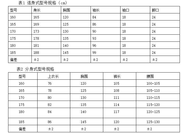 防護(hù)服號(hào)型分為160、165、170、175、180、185,型號(hào)規(guī)格見表1 和表2 。